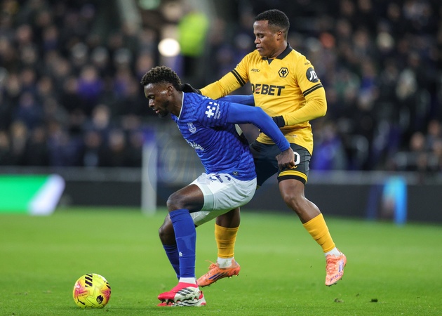 Tim Iroegbunam of Everton holds off Jhon Arias of Wolverhampton Wanderers during the Premier League match Everton vs Wolverhampton Wanderers at Hill Dickinson Stadium, Liverpool, United Kingdom, 7th January 2026, Credit:Richard Bierton/News Images / Avalon