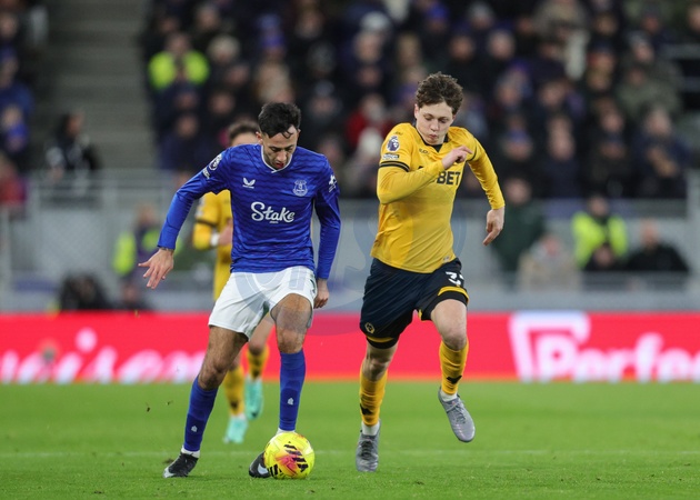Dwight McNeil of Everton passes the ball under pressure from Ladislav Krejci of Wolverhampton Wanderers during the Premier League match Everton vs Wolverhampton Wanderers at Hill Dickinson Stadium, Liverpool, United Kingdom, 7th January 2026, Credit:Richard Bierton/News Images / Avalon