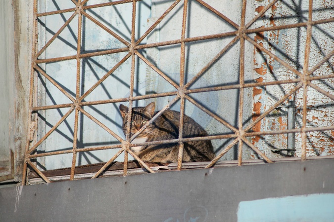 A tabby stray cat soaks in the sun behind bars in winter, Kyiv, Ukraine, January 5, 2026., Credit:Yuliia Ovsiannikova / Avalon