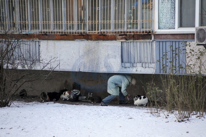 A woman feeds stray cats sheltering from the winter cold in the basement of an apartment block in Kyiv, Ukraine, on January 5, 2026., Credit:Yuliia Ovsiannikova / Avalon