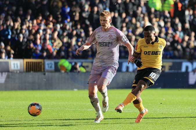 Jhon Arias of Wolverhampton Wanderers scores to make it 2-0 during the Emirates FA Cup Third Round match Wolverhampton Wanderers vs Shrewsbury Town at Molineux, Wolverhampton, United Kingdom, 10th January 2026, Credit:Euan Manning/News Images / Avalon