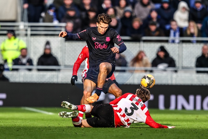 Tyler Dibling of Everton is tackled by Dennis Cirkin of Sunderland during the Emirates FA Cup Third Round match Everton vs Sunderland at Hill Dickinson Stadium, Liverpool, United Kingdom, 10th January 2026, Credit:Ae Cosgrove/News Images / Avalon