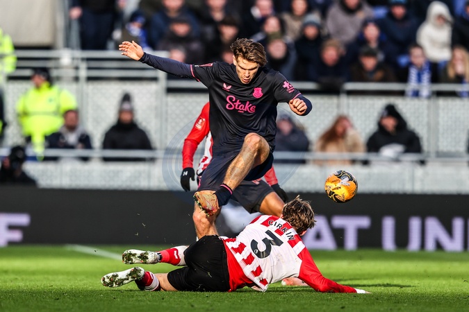 Tyler Dibling of Everton is tackled by Dennis Cirkin of Sunderland during the Emirates FA Cup Third Round match Everton vs Sunderland at Hill Dickinson Stadium, Liverpool, United Kingdom, 10th January 2026, Credit:Ae Cosgrove/News Images / Avalon