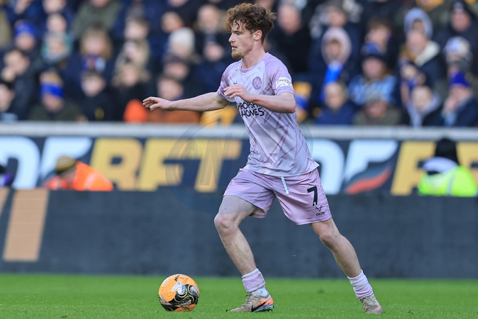 Tommy McDermott of Shrewsbury Town with the ball during the Emirates FA Cup Third Round match Wolverhampton Wanderers vs Shrewsbury Town at Molineux, Wolverhampton, United Kingdom, 10th January 2026, Credit:Euan Manning/News Images / Avalon