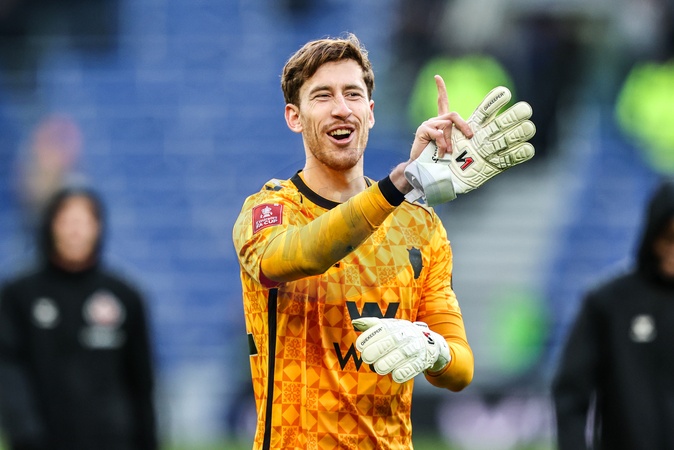 Sunderland goalkeeper Robin Roefs celebrates with the travelling fans after making 3 consecutive penalty saves in a penalty shootout during the Emirates FA Cup Third Round match Everton vs Sunderland at Hill Dickinson Stadium, Liverpool, United Kingdom, 10th January 2026, Credit:Ae Cosgrove/News Images / Avalon