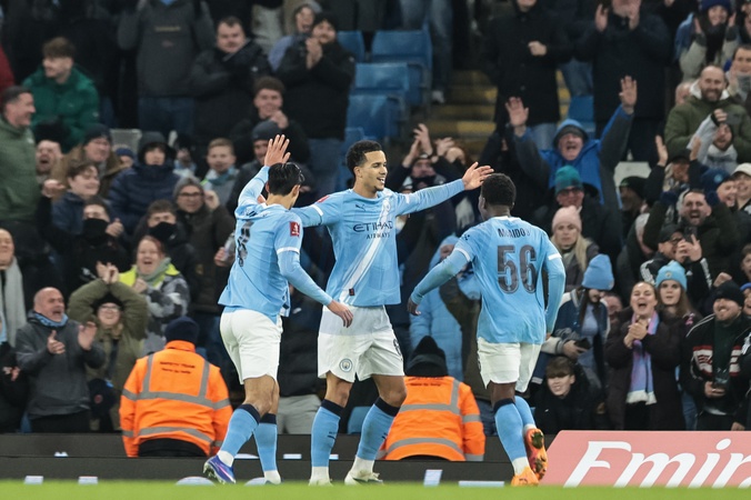 Ryan McAidoo of Manchester City celebrates his goal to make it 9-0 during the Emirates FA Cup Third Round match Manchester City vs Exeter City at Etihad Stadium, Manchester, United Kingdom, 10th January 2026, Credit:Mark Cosgrove/News Images / Avalon