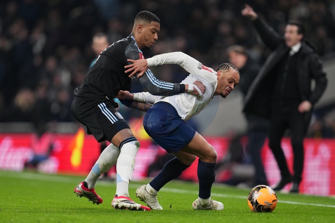 Xavi Simons of Tottenham Hotspur and Ezri Konsa of Aston Villa battle during the Emirates FA Cup Third Round match Tottenham Hotspur vs Aston Villa at Tottenham Hotspur Stadium, London, United Kingdom, 10th January 2026, Credit:Harvey Murphy/News Images / Avalon