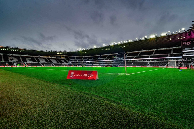 A ground shot showing the pitch and the Emirates FA Cup banner during the Emirates FA Cup Third Round match Derby County vs Leeds United at Pride Park Stadium, Derby, United Kingdom, 11th January 2026, Credit:Maynard Manyowa/News Images / Avalon
