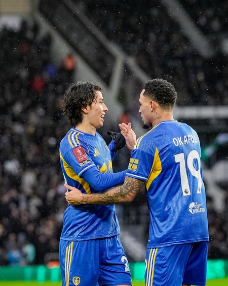 Ao Tanaka of Leeds United celebrates his goal to make it 1-2 during the Emirates FA Cup Third Round match Derby County vs Leeds United at Pride Park Stadium, Derby, United Kingdom, 11th January 2026, Credit:Maynard Manyowa/News Images / Avalon
