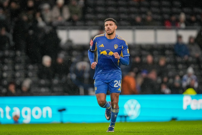 James Justin of Leeds United celebrates his goal to make it 1-3 during the Emirates FA Cup Third Round match Derby County vs Leeds United at Pride Park Stadium, Derby, United Kingdom, 11th January 2026, Credit:Maynard Manyowa/News Images / Avalon