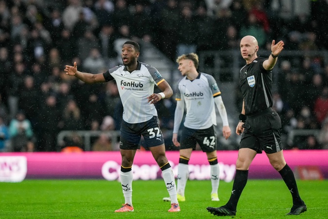 Ebou Adams of Derby County reacts after Referee Anthony Taylor makes a decision during the Emirates FA Cup Third Round match Derby County vs Leeds United at Pride Park Stadium, Derby, United Kingdom, 11th January 2026, Credit:Maynard Manyowa/News Images / Avalon
