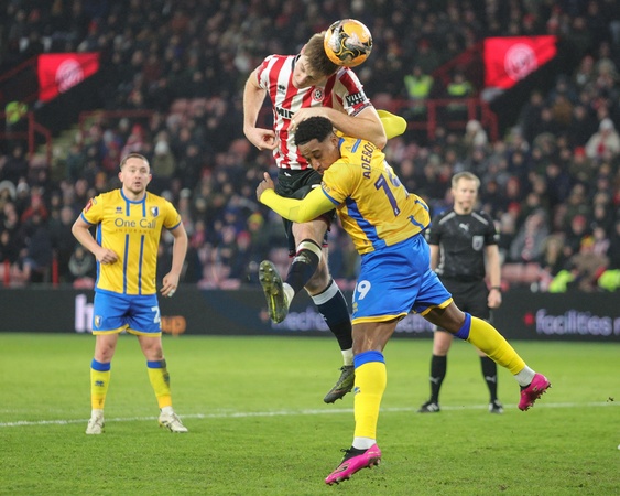 Mark McGuinness of Sheffield United heads on goal during the Emirates FA Cup Third Round match Sheffield United vs Mansfield Town at Bramall Lane, Sheffield, United Kingdom, 11th January 2026, Credit:Richard Bierton/News Images / Avalon