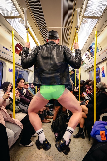 Participants take part in the annual No Trousers Tube Ride on the London Underground in London, UK, on 11 January 2026, travelling on trains without trousers as part of the event, which began in New York in 2002 and has since taken place in cities around the world., Credit:Pete Speller / Avalon
