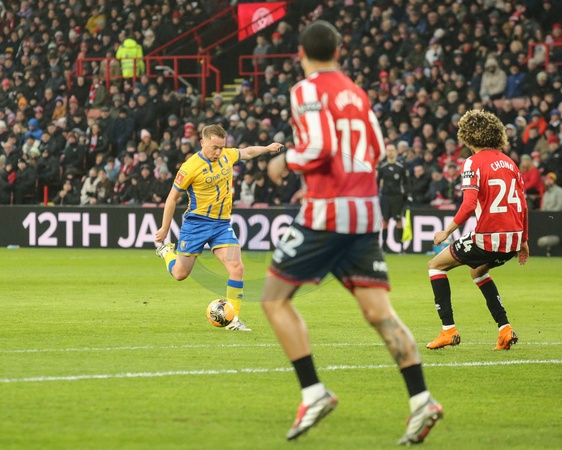 Louis Reed of Mansfield Town scores to make it 0-1 during the Emirates FA Cup Third Round match Sheffield United vs Mansfield Town at Bramall Lane, Sheffield, United Kingdom, 11th January 2026, Credit:Richard Bierton/News Images / Avalon
