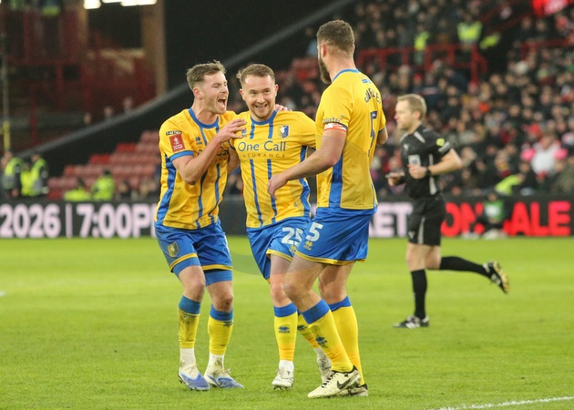 Louis Reed of Mansfield Town celebrates his goal to make it 0-1 during the Emirates FA Cup Third Round match Sheffield United vs Mansfield Town at Bramall Lane, Sheffield, United Kingdom, 11th January 2026, Credit:Richard Bierton/News Images / Avalon