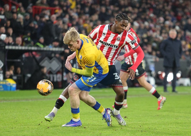 Femi Seriki of Sheffield United is tackled by Will Evans of Mansfield Town during the Emirates FA Cup Third Round match Sheffield United vs Mansfield Town at Bramall Lane, Sheffield, United Kingdom, 11th January 2026, Credit:Richard Bierton/News Images / Avalon