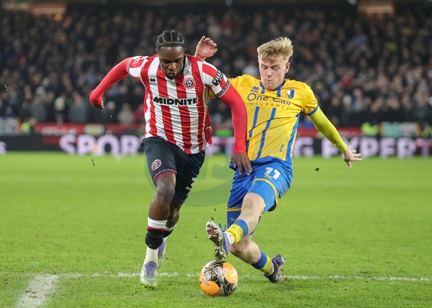 Femi Seriki of Sheffield United is tackled by Will Evans of Mansfield Town during the Emirates FA Cup Third Round match Sheffield United vs Mansfield Town at Bramall Lane, Sheffield, United Kingdom, 11th January 2026, Credit:Richard Bierton/News Images / Avalon