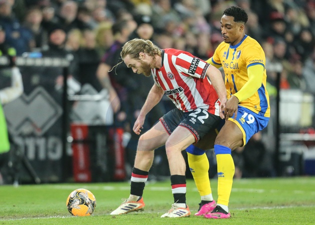 Tom Davies of Sheffield United holds off Victor Adeboyejo of Mansfield Town during the Emirates FA Cup Third Round match Sheffield United vs Mansfield Town at Bramall Lane, Sheffield, United Kingdom, 11th January 2026, Credit:Richard Bierton/News Images / Avalon