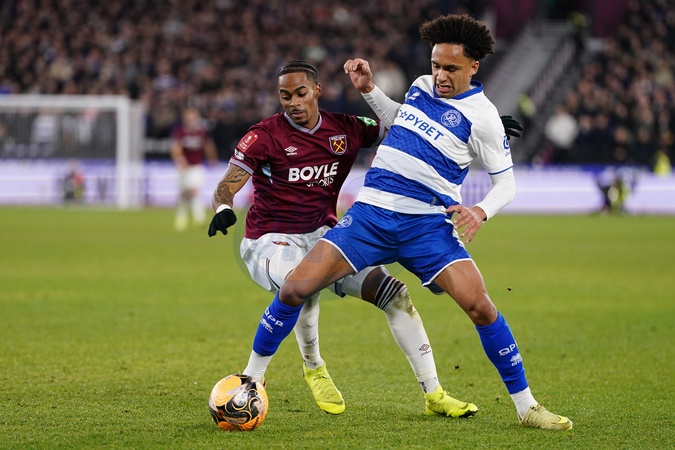 Crysencio Summerville of West Ham United and Kealey Adamson of Queens Park Rangers during the Emirates FA Cup Third Round match West Ham United vs Queens Park Rangers at London Stadium, London, United Kingdom, 11th January 2026, Credit:Harvey Murphy/News Images / Avalon
