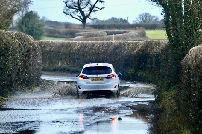 Cars drive through the surface water along the country lanes., Credit:Geoffrey Swaine / Avalon