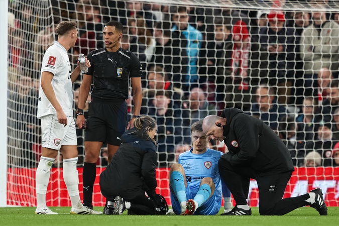 Barnsley goalkeeper Murphy Cooper receives treatment during the Emirates FA Cup Third Round match Liverpool vs Barnsley at Anfield, Liverpool, United Kingdom, 12th January 2026, Credit:Ae Cosgrove/News Images / Avalon