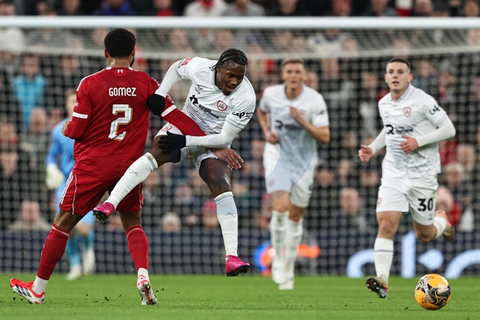 Reyes Cleary of Barnsley is fouled by Joe Gomez of Liverpool during the Emirates FA Cup Third Round match Liverpool vs Barnsley at Anfield, Liverpool, United Kingdom, 12th January 2026, Credit:Ae Cosgrove/News Images / Avalon