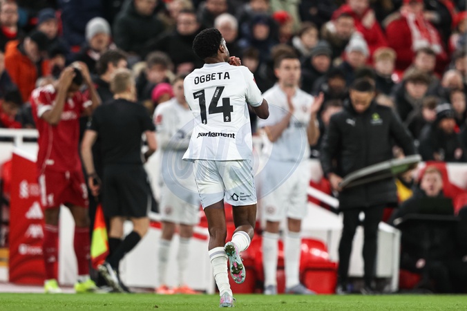Nathanael Ogbeta of Barnsley applauds by the fans as he is subbed off during the Emirates FA Cup Third Round match Liverpool vs Barnsley at Anfield, Liverpool, United Kingdom, 12th January 2026, Credit:Ae Cosgrove/News Images / Avalon