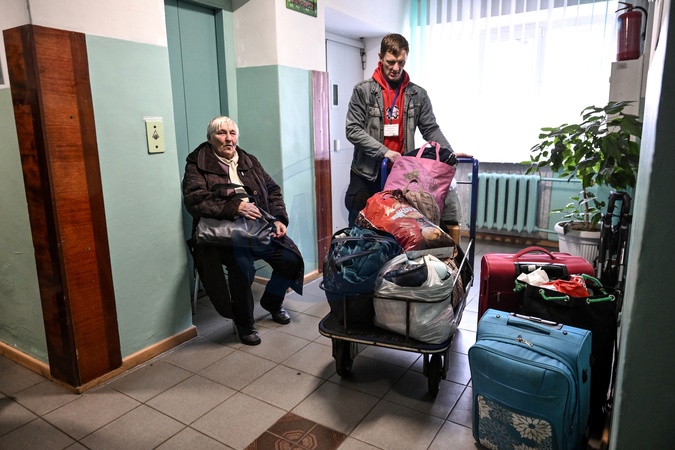 A man helps a woman with limited mobility evacuated from a frontline community bring her belongings into a temporary accommodation room at a transit center for evacuees that began operating on November 25, 2025, Zaporizhzhia, Ukraine, on January 8, 2026. The facility functions as a one-stop shop, where evacuees can process documents, open bank accounts, and receive financial, humanitarian, psychological, and legal assistance. Evacuees are able to stay at the center for three to seven days before being relocated to temporary housing in the regional center or to safer parts of Ukraine. The center has already assisted around 1,500 people, Credit:Dmytro Smolienko / Avalon