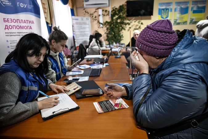 A volunteer records passport details of a woman evacuated from a frontline community at a transit center that began operating on November 25, 2025, Zaporizhzhia, Ukraine, on January 8, 2026. The facility functions as a one-stop shop, where evacuees can process documents, open bank accounts, and receive financial, humanitarian, psychological, and legal assistance. Evacuees are able to stay at the center for three to seven days before being relocated to temporary housing in the regional center or to safer parts of Ukraine. The center has already assisted around 1,500 people, Credit:Dmytro Smolienko / Avalon