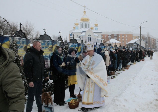 Rector of the Nativity of the Blessed Virgin Mary Church Archpriest Dmytro Koshka sprinkles holy water on worshippers during the Epiphany celebration, Borodianka, Kyiv region, Ukraine, on January 6, 2026, Credit:Volodymyr Tarasov / Avalon