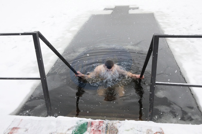 A young man immerses himself in an ice hole during the Epiphany celebration in Borodianka, Kyiv region, Ukraine, on January 6, 2026, Credit:Volodymyr Tarasov / Avalon