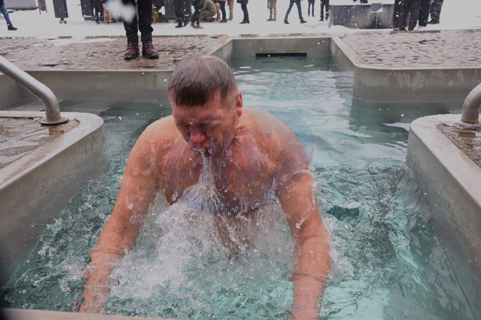 A man plunges into a baptismal font during the Epiphany celebration at Sarzhyn Yar in Kharkiv, Ukraine, on January 6, 2026, Credit:Viacheslav Madiievskyi / Avalon