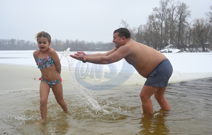 A man splashes water on a girl during the Epiphany celebration at Hydropark in Kyiv, Ukraine, on January 6, 2026, Credit:Yevhen Kotenko / Avalon