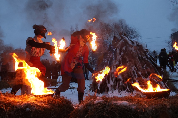 People take part in a fire show during the Epiphany celebration by Yordanske Lake in the Obolonskyi district of Kyiv, Ukraine, on January 6, 2026, Credit:Pavlo Bahmut / Avalon