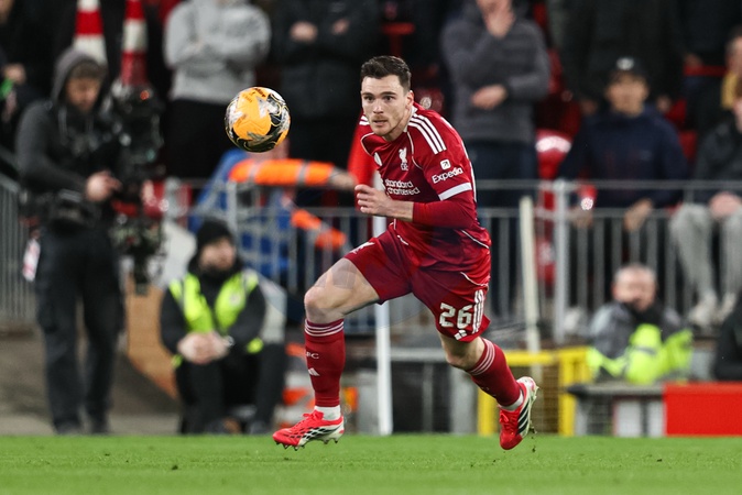 Andrew Robertson of Liverpool with the ball during the Emirates FA Cup Third Round match Liverpool vs Barnsley at Anfield, Liverpool, United Kingdom, 12th January 2026, Credit:Ae Cosgrove/News Images / Avalon
