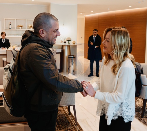 January 13, 2026, Ciampino Airport. Trentini and Burlò arrive in Italy. Pictured is Alberto Trentini and Prime Minister Giorgia Meloni., Credit:Press Office / Avalon