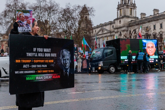 Parliament Square, London, UK. 13th January 2026.Activists and members of the Iranian community in London held their 63rd weekly protest opposite the Houses of Parliament, demanding that US President, Donald Trump take immediate action following reports of mass killings of protesters in Iran.The Government cut internet services and phone lines in Iran on the 8th Jan, in an attempt to hide the extent of the protests and proof of mass killings reaching the wider world., Credit:Photo by Amanda Rose / Avalon