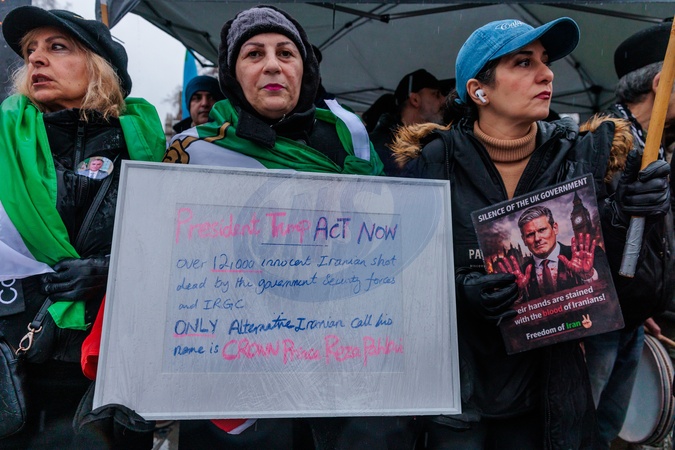 Parliament Square, London, UK. 13th January 2026.Activists and members of the Iranian community in London held their 63rd weekly protest opposite the Houses of Parliament, demanding that US President, Donald Trump take immediate action following reports of mass killings of protesters in Iran.The Government cut internet services and phone lines in Iran on the 8th Jan, in an attempt to hide the extent of the protests and proof of mass killings reaching the wider world., Credit:Photo by Amanda Rose / Avalon