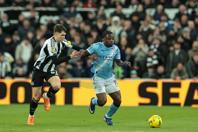 Jeremy Doku of Manchester City breaks with the ball tracked by Lewis Miley of Newcastle Untied during the Carabao Cup Semi-finals First Leg Newcastle United vs Manchester City at St. James's Park, Newcastle, United Kingdom, 13th January 2026, Credit:Mark Cosgrove/News Images / Avalon