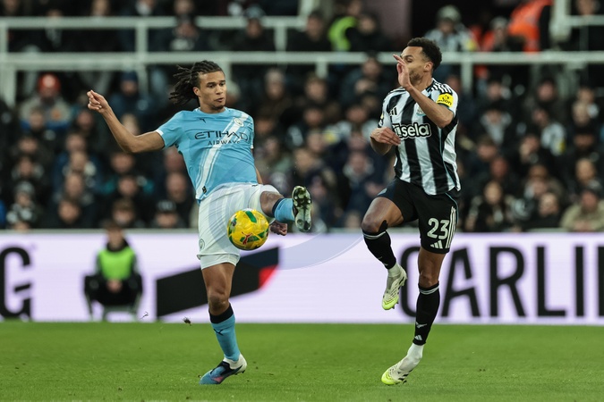 Nathan Ake of Manchester City controls the ball as Jacob Murphy of Newcastle Untied pressures during the Carabao Cup Semi-finals First Leg Newcastle United vs Manchester City at St. James's Park, Newcastle, United Kingdom, 13th January 2026, Credit:Mark Cosgrove/News Images / Avalon