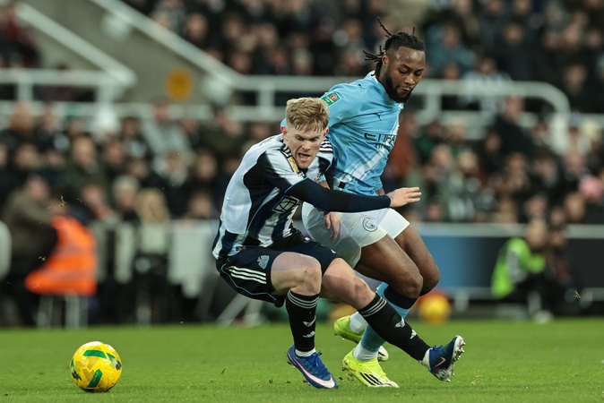 Lewis Hall of Newcastle Untied holds off Antonie Semenyo of Manchester City during the Carabao Cup Semi-finals First Leg Newcastle United vs Manchester City at St. James's Park, Newcastle, United Kingdom, 13th January 2026, Credit:Mark Cosgrove/News Images / Avalon