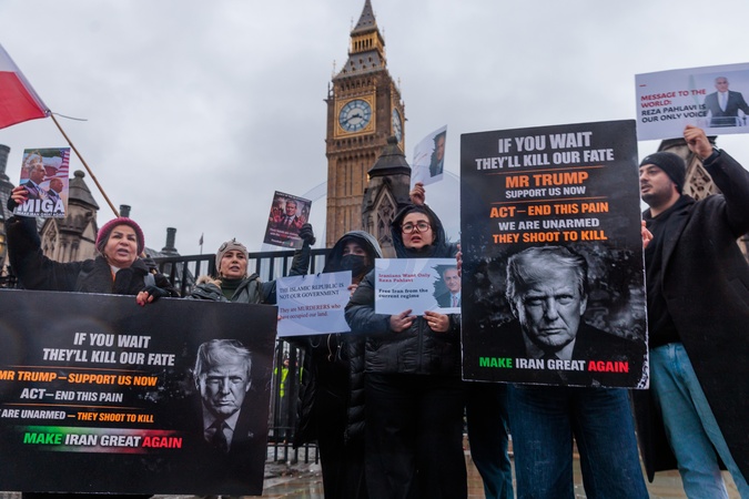 Parliament Square, London, UK. 13th January 2026.Activists and members of the Iranian community in London held their 63rd weekly protest opposite the Houses of Parliament, demanding that US President, Donald Trump take immediate action following reports of mass killings of protesters in Iran.The Government cut internet services and phone lines in Iran on the 8th Jan, in an attempt to hide the extent of the protests and proof of mass killings reaching the wider world., Credit:Photo by Amanda Rose / Avalon