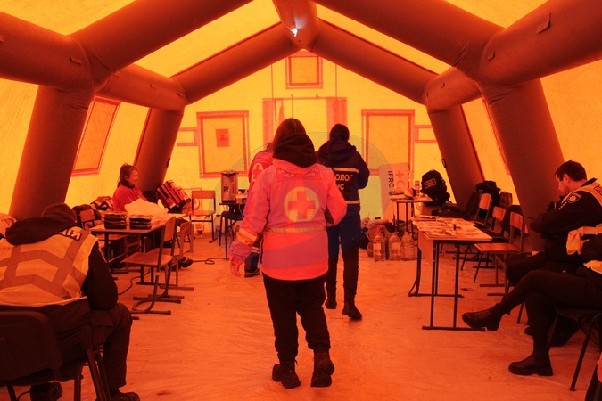 Ukrainian Red Cross Society volunteers and police officers are on duty in a heating tent set up in the Desnianskyi district of Kyiv, Ukraine, January 12, 2026. As work to restore a stable power supply after another Russian strike is ongoing in the Ukrainian capital, rescuers provide residents of the city's left bank districts with a place to warm up, charge devices and, if needed, receive psychological support at mobile Points of Invincibility operating in the tents of the State Emergency Service. Each tent is equipped with heat guns, generators and places for visitors where they can take a rest., Credit:Hennadii Minchenko / Avalon