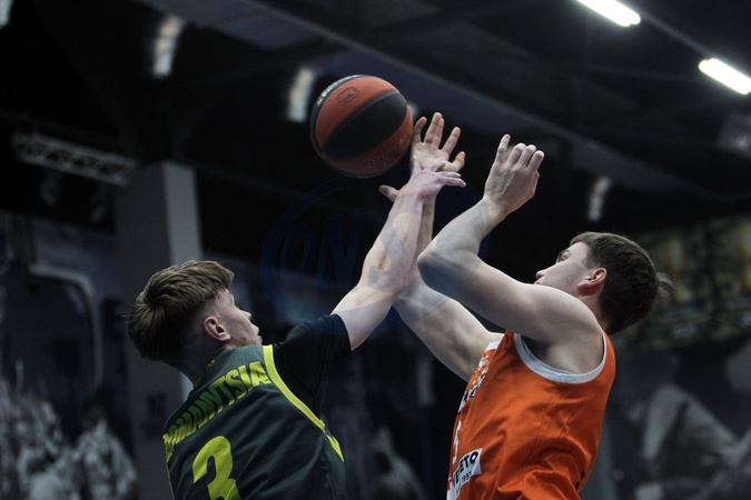 Guard Artem Romanytsia (L) of BC Kyiv Basket is in action with a player of BC Cherkaski Mavpy (Cherkasy Monkeys) during the 2025/2026 Ukrainian Basketball SuperLeague Round 9 match at the Shynnyk Culture and Sports Complex, Dnipro, Ukraine, January 10, 2026., Credit:Mykola Miakshykov / Avalon