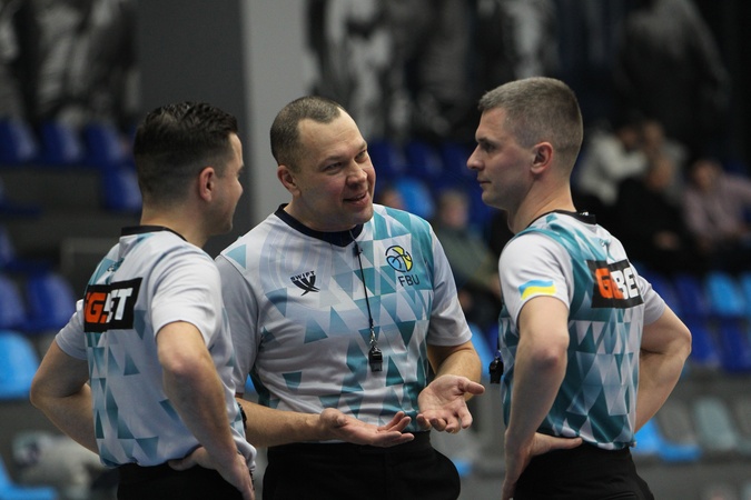 Referees talk during the 2025/2026 Ukrainian Basketball SuperLeague Round 9 match between BC Kharkivski Sokoly (Kharkiv Falcons) and BC Rivne-OSHVSM at the Shynnyk Culture and Sports Complex, Dnipro, Ukraine, January 10, 2026., Credit:Mykola Miakshykov / Avalon
