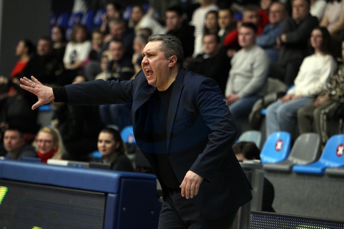 Head coach of BC Kharkivski Sokoly (Kharkiv Falcons) Valerii Plekhanov shouts from the sideline during the 2025/2026 Ukrainian Basketball SuperLeague Round 9 match against BC Rivne-OSHVSM at the Shynnyk Culture and Sports Complex, Dnipro, Ukraine, January 10, 2026., Credit:Mykola Miakshykov / Avalon