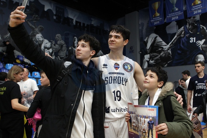 Fans take a selfie with guard Ihor Klimov of BC Kharkivski Sokoly (Kharkiv Falcons) after the 2025/2026 Ukrainian Basketball SuperLeague Round 9 match against BC Rivne-OSHVSM at the Shynnyk Culture and Sports Complex, Dnipro, Ukraine, January 10, 2026., Credit:Mykola Miakshykov / Avalon