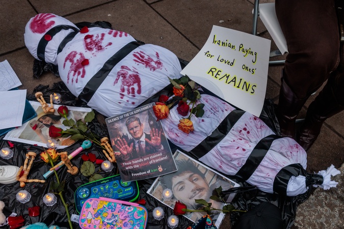 Iranian Embassy, London, UK. 14th January 2026.A replica of a body wrapped in a bloody shroud, representing the estimated tens of thousands of people killed by the Islamic Regime since the Iranian Government cut internet services and phone lines on the 8th January. The handwritten sign alongside reads ‘Iranian Paying for Loved Ones Remains' is sharing some of the limited stories coming from inside Iran that the Islamic Regime are charging grieving family members so they can recover their loved ones bodies., Credit:Photo by Amanda Rose / Avalon