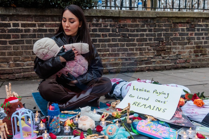 Iranian Embassy, London, UK. 14th January 2026.A protester cradles a blood spattered baby's pram suit, beside a replica body wrapped in a bloody shroud representing the loss of life during the protests in Iran.It is estimated 12,000 protesters have been killed by the Islamic Regime since they cut internet services and phone lines on the 8th January. The handwritten sign alongside reads ‘Iranian Paying for Loved Ones Remains' it is believed that grieving family members have to pay to recover their loved ones bodies., Credit:Photo by Amanda Rose / Avalon