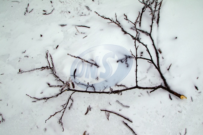 A broken ice-covered branch lies in the snow after freezing rain, Kyiv, Ukraine, January 9, 2026., Credit:Kirill Chubotin / Avalon
